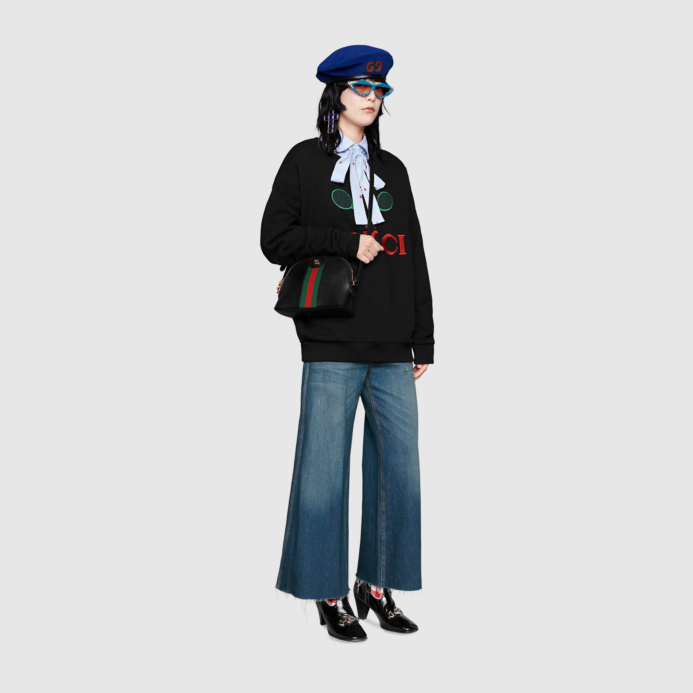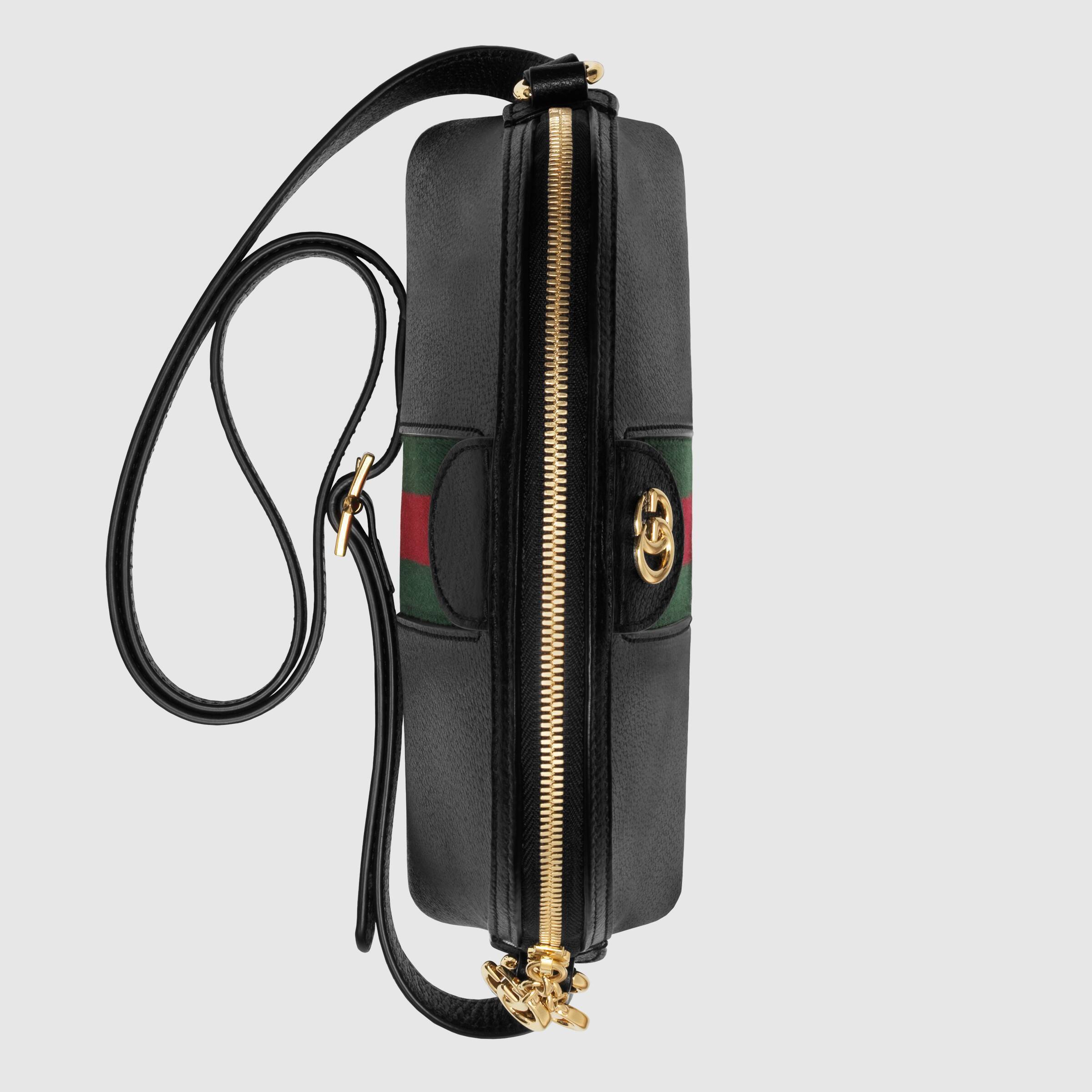 ラウンドトップの〔オフィディア〕ショルダーバッグの新作が最新コレクションに登場。ブラックレザーで仕立て、グリーン/レッド/グリーンのウェブ ストライプを配しています。1970年代のアーカイブに使用されていたベルトバックルをコンテンポラリーにアレンジし、フロントタブとジッパープルに小さなダブルG ディテールを施した人気のスタイルを、キュートなスモールサイズに仕上げました。