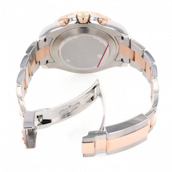オイスタースチールロレックスのスチール製モデルのケースには、オイスタースチールが使用されている。オイスタースチールは904Lスチール系統に属し、最も一般的には、最高の耐蝕性が不可欠なハイテク産業や航空宇宙、化学産業で使用されている。オイスタースチールは非常に耐久性があり、研磨性にも優れている。どれほど過酷な環境下でも、その美しさを保ち続ける。ホワイトダイアルヨットマスターⅡは、ロレックスのプロフェッショナルモデルの特徴である新しい針が採用された新ダイアルを搭載。視認性が向上し、デザインの美しさが際立つ。新しいダイアルのアワーマーカーは12 時位置が三角形、6 時位置が長方形で、より直感的に時刻を読み取ることができる。時針の先端は発光性のディスク型になり、分針とはっきり区別することが可能だ。ヨットマスターⅡは 1 分~ 10分までのカウントダウンをプログラムできる機能が搭載されている。プログラミングは機械に記憶されるため、リセットすると前回の設定に戻る。レース開始後は、公式カウントダウンに合わせ、瞬時に同期させることができる。オイスター ブレスレットオイスター ブレスレットは、形と機能、美しさと技術の完璧な融合であり、堅牢な構造と快適な着用感を特徴とする。ブレスレットに備わるオイスターロック フォールディングクラスプは、誤って開いてしまうことを防ぐ。また、ブレスレットを延長するためのイージーリンクもロレックス独自の発明である。この独創的なシステムにより、ブレスレットの長さを約5 mm延長させることができ、あらゆる場面でより快適な装着感が実現する。4161 ムーブメントヨットマスターⅡには、ロレックスが開発・製造した機械式自動巻クロノグラフムーブメント、キャリバー4161が搭載されている。その構造、製造品質と革新的な特徴により、並外れた精度と信頼性を誇る。ロレックスの技術の結晶ともいえるこのムーブメントは35,000時間以上もの開発期間を経て完成し、特許機能を搭載した、約360 個の部品で構成されている。一部の部品はロレックスの自社内で行われるミクロ製造技術、UV-LiGA で製造されている。この技術により、従来の方法では製造できなかった微細な部品や複雑な形状の部品が製造できるようになった。リングコマンドベゼルべゼルの目的と機能を再定義することで、ロレックスは、ヨットマスターⅡのベゼルの開発に成功した。通常、時計のベゼルは内部メカニズムと独立して機能する。しかし、ヨットマスターⅡ レガッタ クロノグラフのリングコマンドベゼルは、内部メカニズムと連動。ムーブメントと連動した機構のひとつとして、文字通り、プログラム可能なカウントダウン機能の重要な役割を果たす。ヨットレースのスタートタイムに合わせてセットでき、誤差修正が可能となった。精巧なデザインとシンプルな操作性を両立し、機能美を極めた腕時計がここに完成した。仕様リファレンス116681ケースケースオイスター、44 mm、オイスタースチール&エバーローズゴールド構造モノブロックミドルケース、スクリュー式裏蓋、リューズ直径44 mm素材エバーローズロレゾール - オイスタースチール&18 ct エバーローズゴールドベゼルロレックス リングコマンド(双方向に90度回転)、18 ct ゴールド製、セラミック製ブルー セラクロムインサート、数字はゴールドコーティングリューズスクリュー式、トリプロック(三重密閉構造)クリスタル傷防止サファイア防水性能100 m/330 フィート防水ムーブメントムーブメントパーペチュアル、機械式、自動巻、レガッタクロノグラフキャリバー4161、ロレックスによる完全自社製造精度日差 - 2 ~ + 2 秒(ケーシング後)機能中央に時針、分針、秒針(6 時位置)。機械式メモリーを備えたプログラムカウントダウン機能、プログラムしたカウントダウン時間を維持してリセット可能。秒針停止機能による正確な時刻設定振動子耐磁性ブルー パラクロム・ヘアスプリング自動巻パーペチュアルローターによる両方向自動巻パワーリザーブ約 72 時間ブレスレットブレスレットオイスター(3 列リンク)ブレスレット 素材エバーローズロレゾール - オイスタースチール&18 ct エバーローズゴールドクラスプセーフティキャッチ付オイスターロック、イージーリンク(約 5 mmのエクステンションリンク)ダイアルダイアルホワイトその他クロマライト ディスプレイ (青色発光の長時間継続ルミネッセンス)認定高精度クロノメーター (COSC、ケーシング後にロレックス認定)