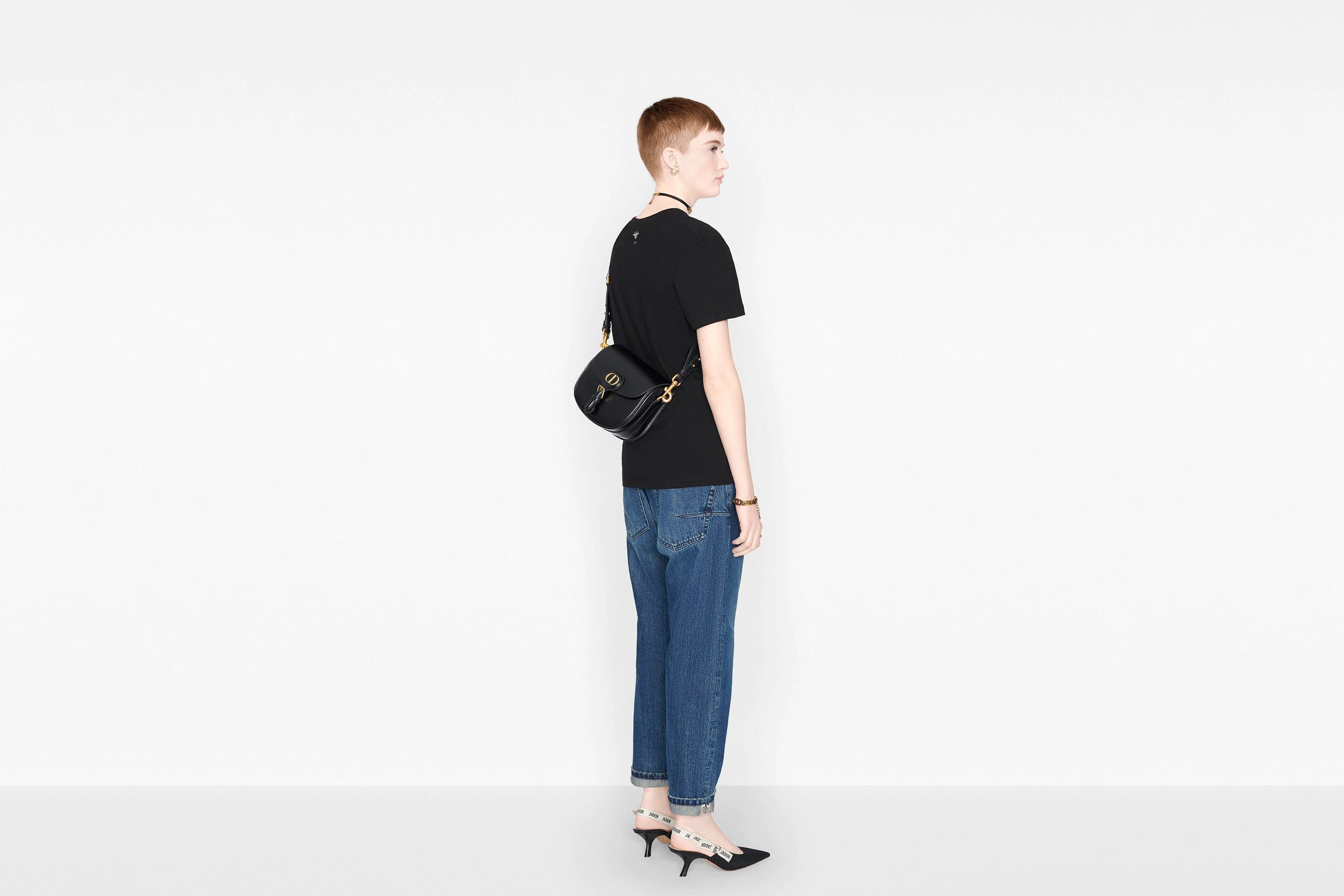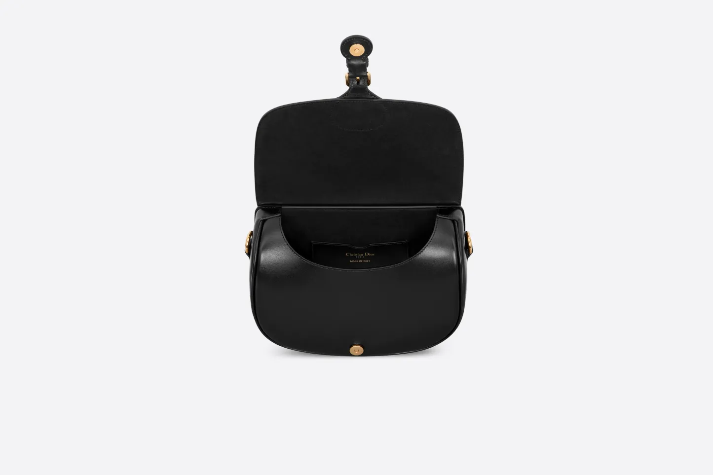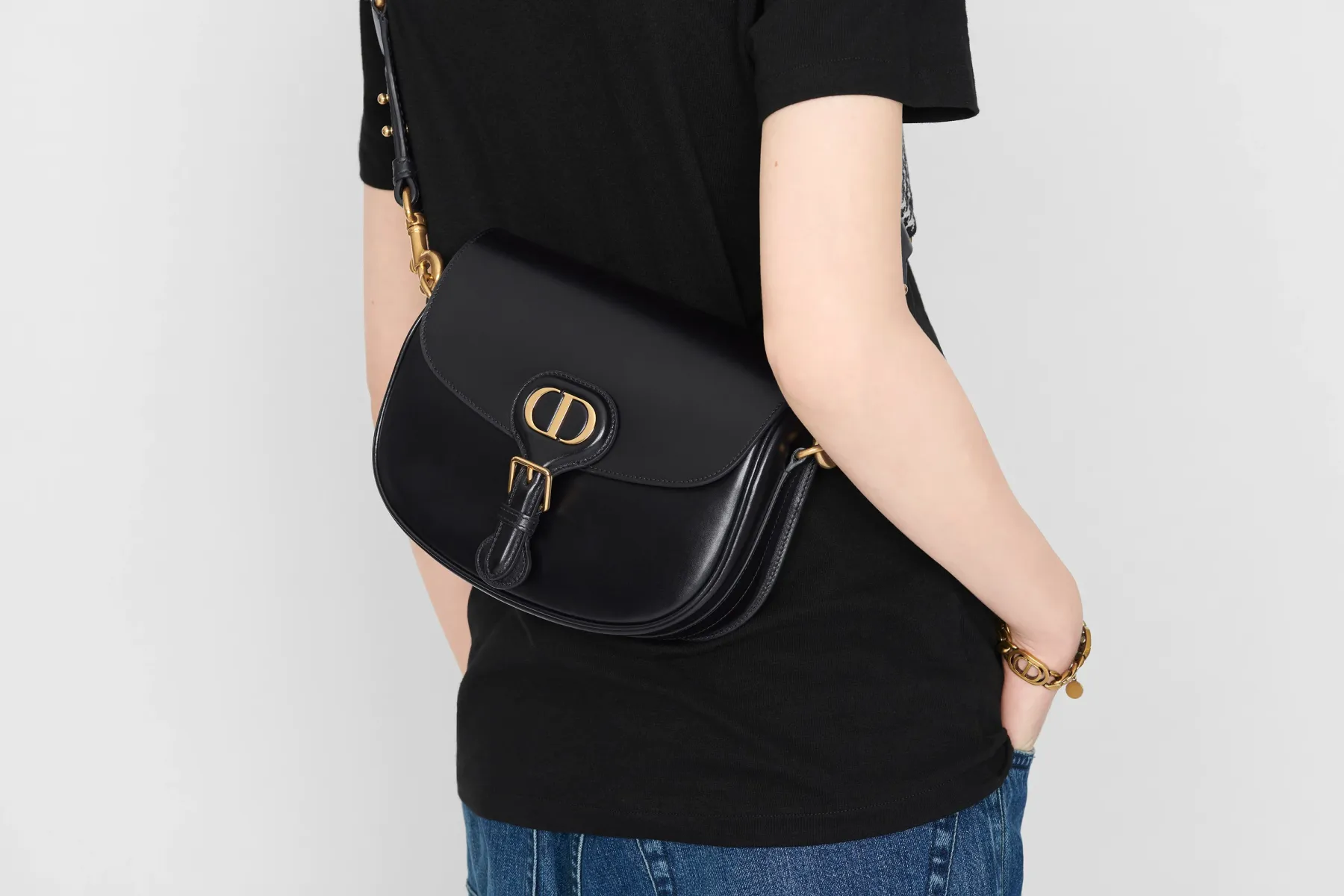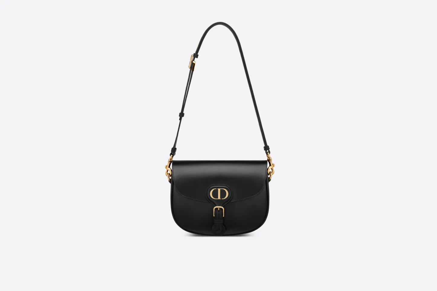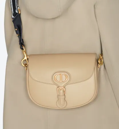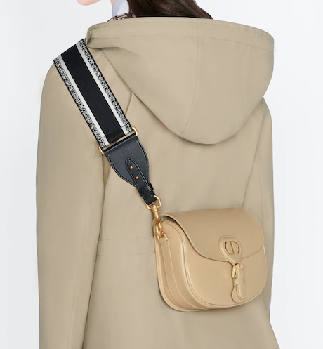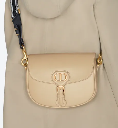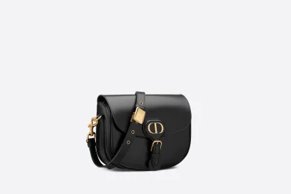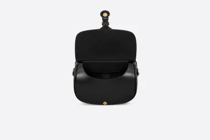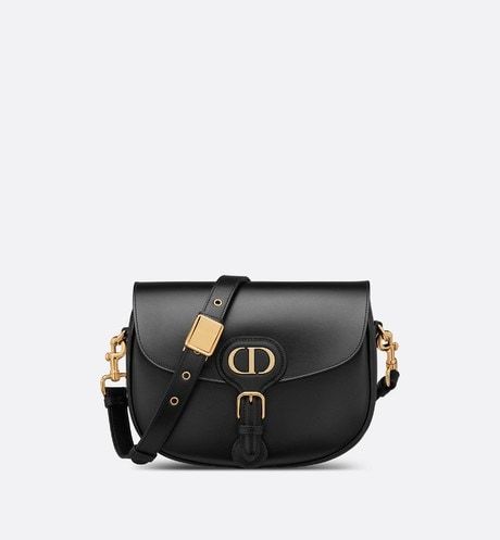 The Dior Bobby bag is a hobo style showcasing sophisticated lines and harmonious proportions. The silhouette is crafted from black box calfskin with a suede calfskin interior for added suppleness. and is enhanced by antique gold-finish metal hardware. Its removable and adjustable shoulder strap has a military-inspired buckle. and allows the medium bag to be carried by hand. worn over the shoulder or crossbody.