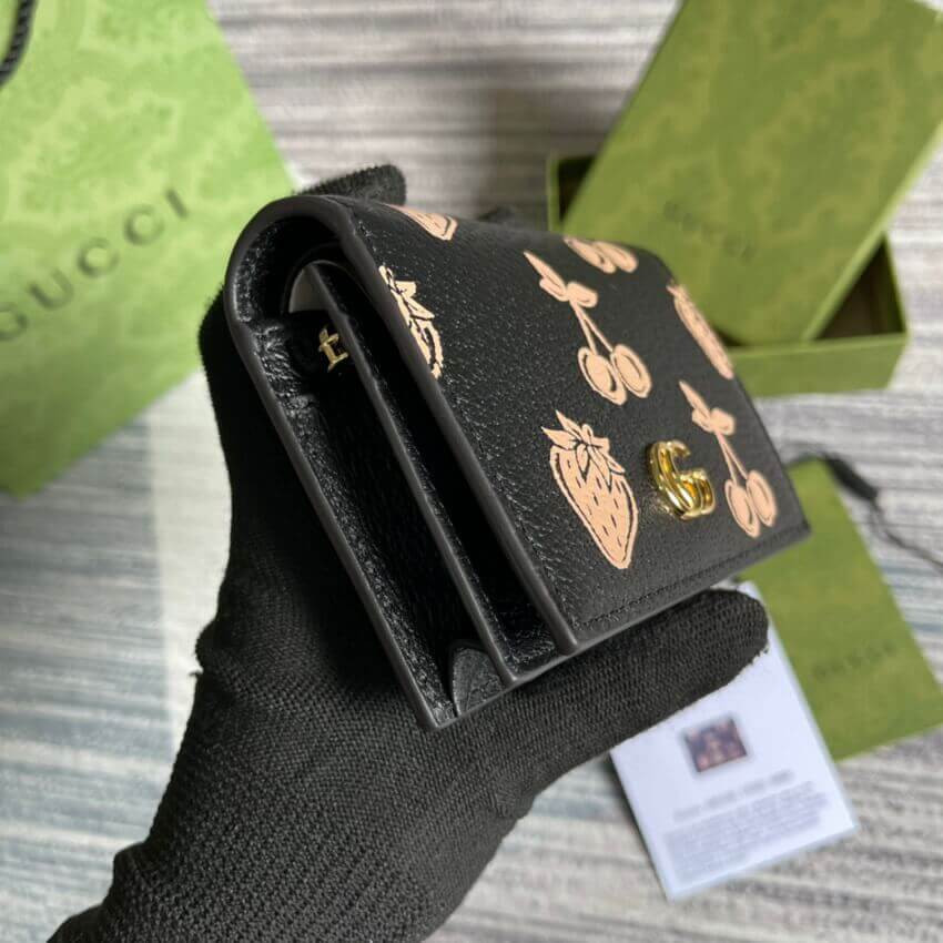 ご覧いただきまして ありがとうございます。GUCCI GGマーモント チェリー ミニ財布です。メタリック仕上げのチェリーといちごが散りばめられた 遊び心溢れるデザインが特徴の折りたたみ財布。GGマーモントのシグネチャーモノグラムハードウェアがあしらわれています。ご自身用へはもちろんのこと 大切な方への贈り物にも喜ばれます☆